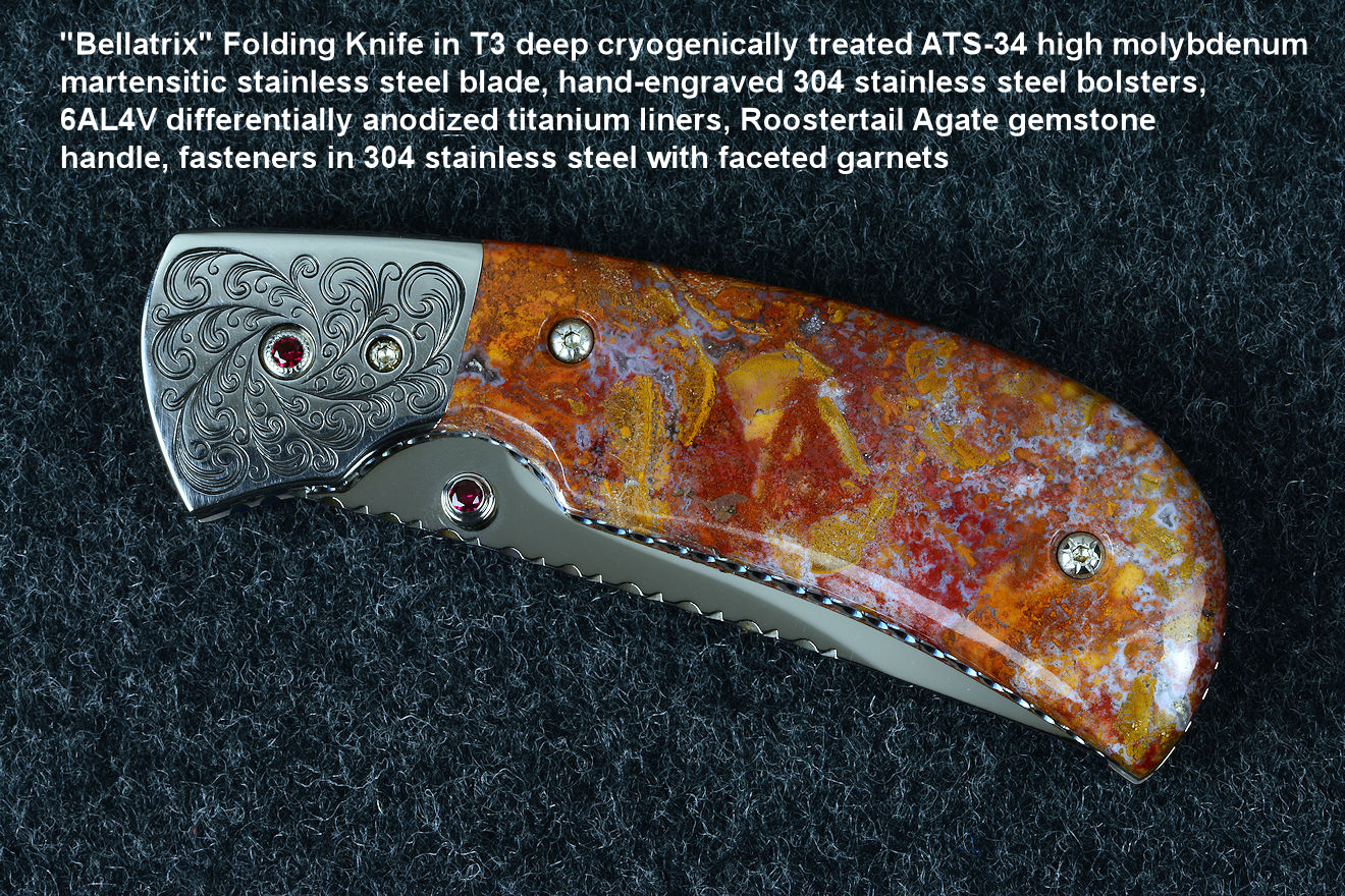 "Kotori" in ATS-34 high molybdenum stainless steel blade, hand-engraveds 304 stainless steel bolsters, Carnival Lace Agate gemstone handle, hand-carved, hand-dyed leather sheath